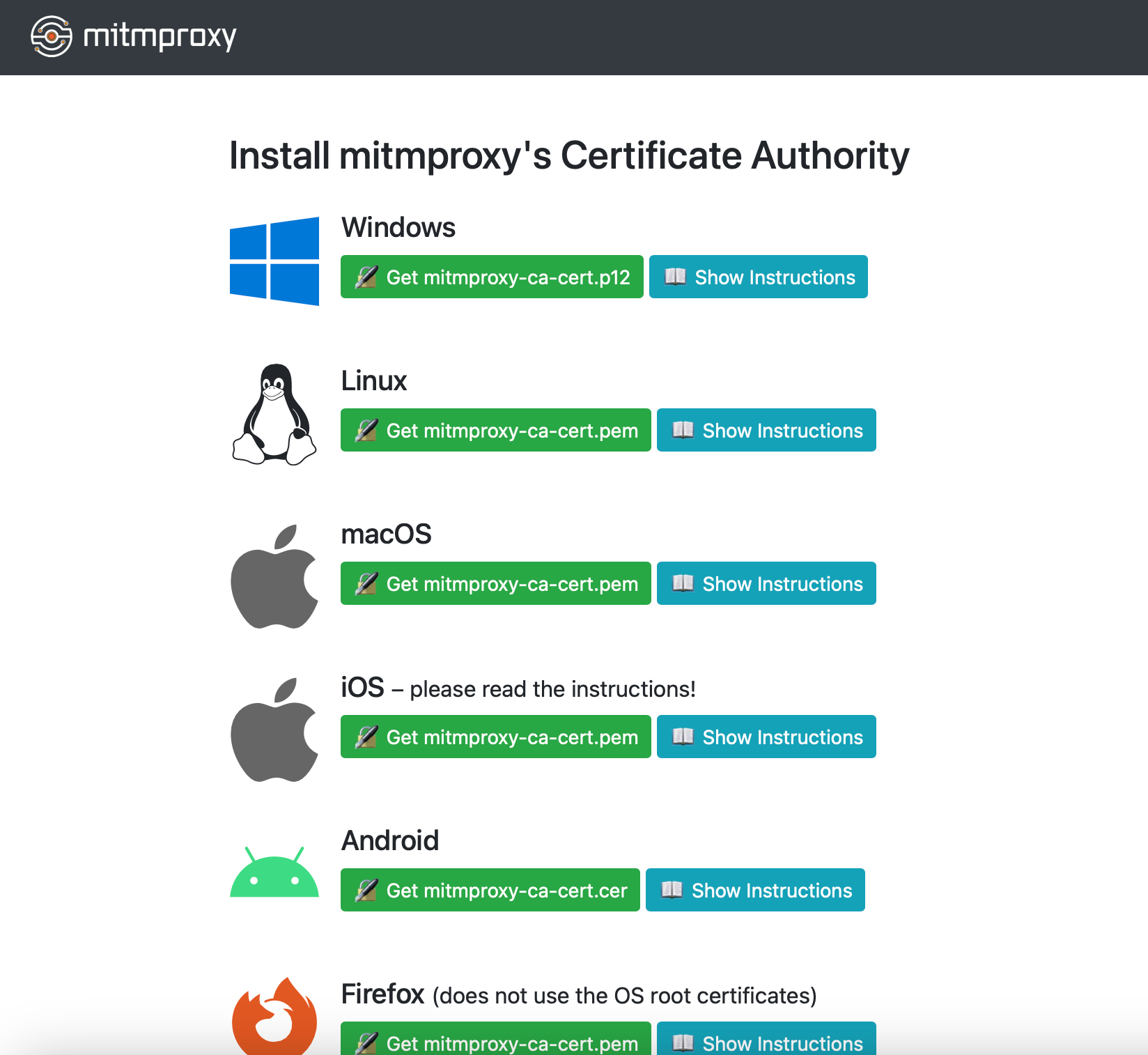 - 在浏览器输入地址 mitm.it,显示效果如果和图中类似,证明前面的步骤都成功了。