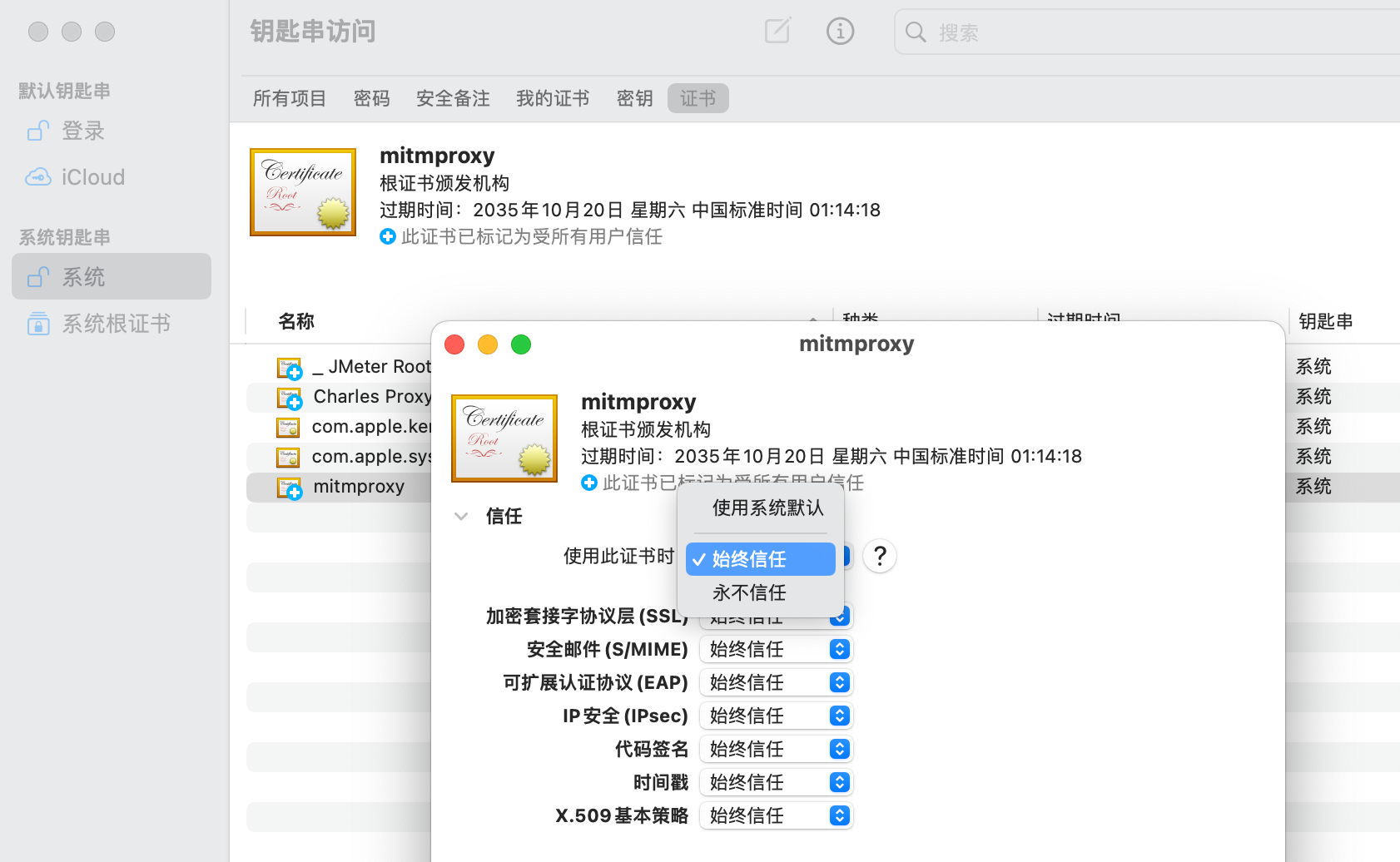 打开证书(Mac 系统为钥匙串访问)->点击证书->双击名称含有 mitmproxy 的选项->点击信任->选择始终信任。