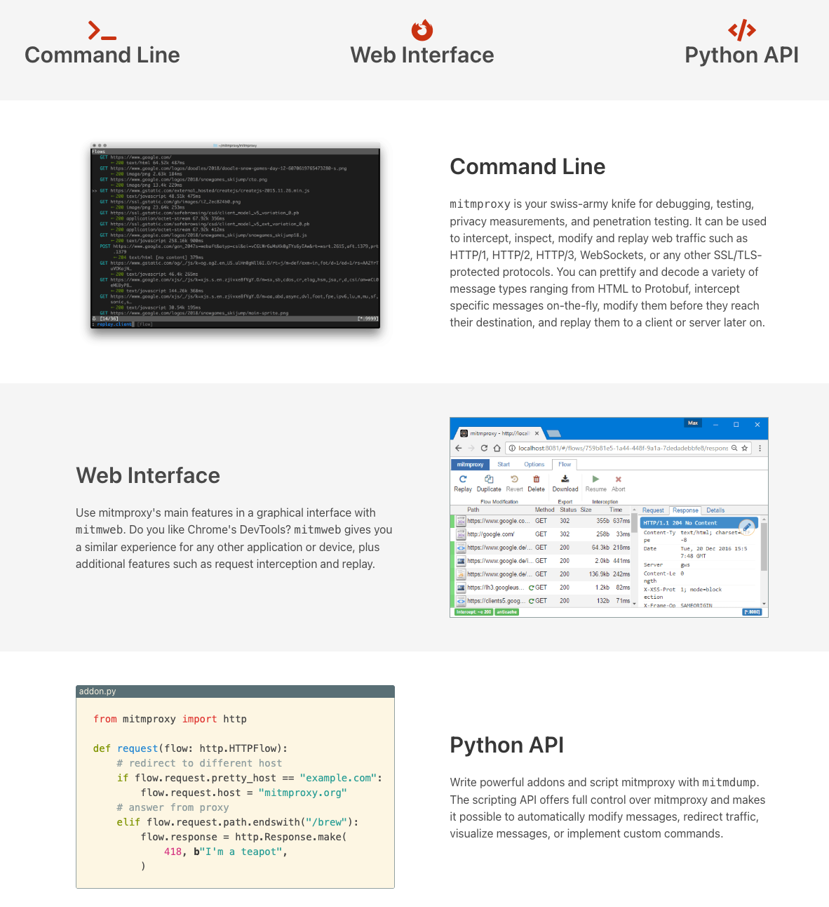 mitmproxy 有三大核心工具,分别为 mitmproxy、mitmweb、mitmdump。mitmdump 是 mitmproxy 相比于其他代理工具最独一无二的部分,所以会以 mitmdump 的介绍为主。