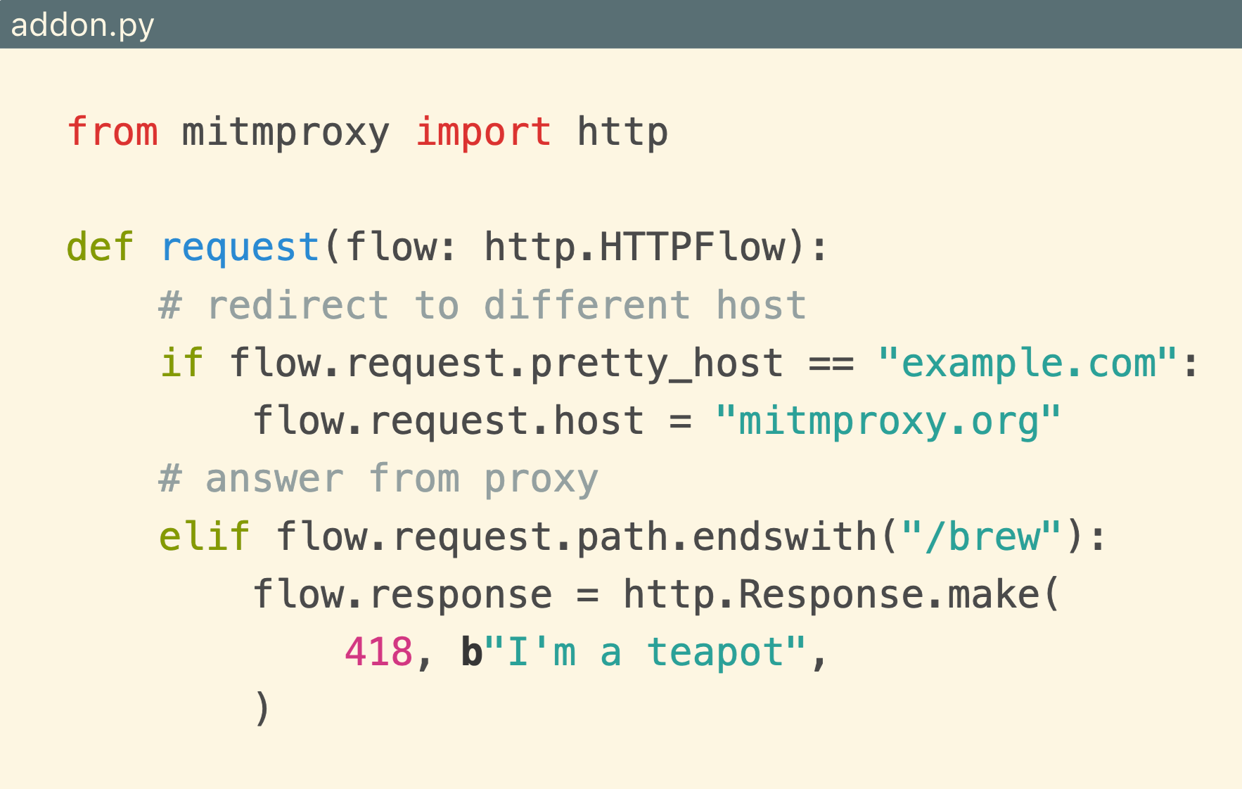 先简单介绍下 mitmproxy,它本质上是一个中间人代理(man-in-the-middle),可以拦截浏览器或 APP 与服务器之间的请求和响应。和其他抓包工具比,它最大亮点是可以通过 Python 插件完全控制流程,做脚本化处理,这对测试工程师做自动化调试或搭建业务定制化 mock 环境非常有用。大家如果需要更多的示例可以到官网查看,这里给大家提供了官网的地址。