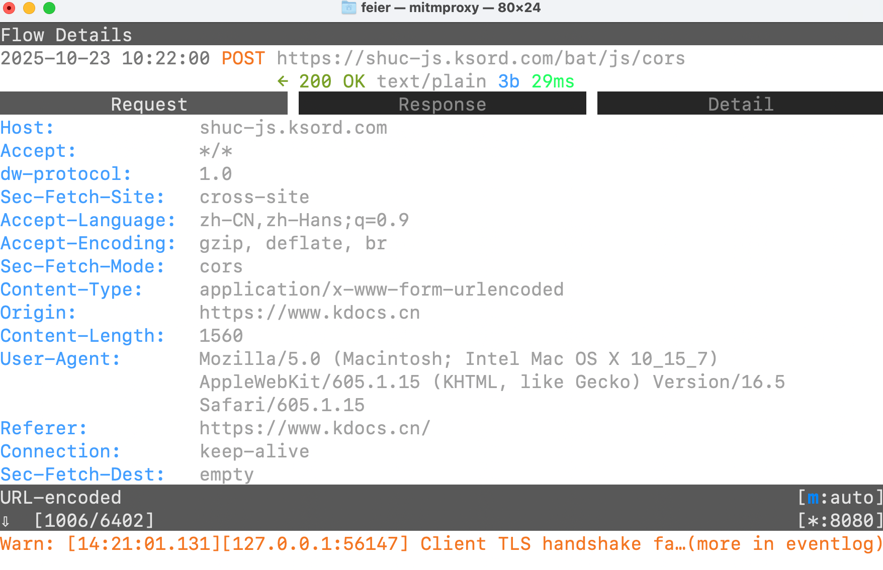 mitmproxy 是一个交互式 CLI 工具,可以在终端里查看请求、修改内容并实时恢复。它支持键盘交互,适合在终端中快速浏览和手动修改流量。不过要注意,mitmproxy 客户端本身并不支持 Windows,在 Windows 上通常使用 mitmweb 或 mitmdump。