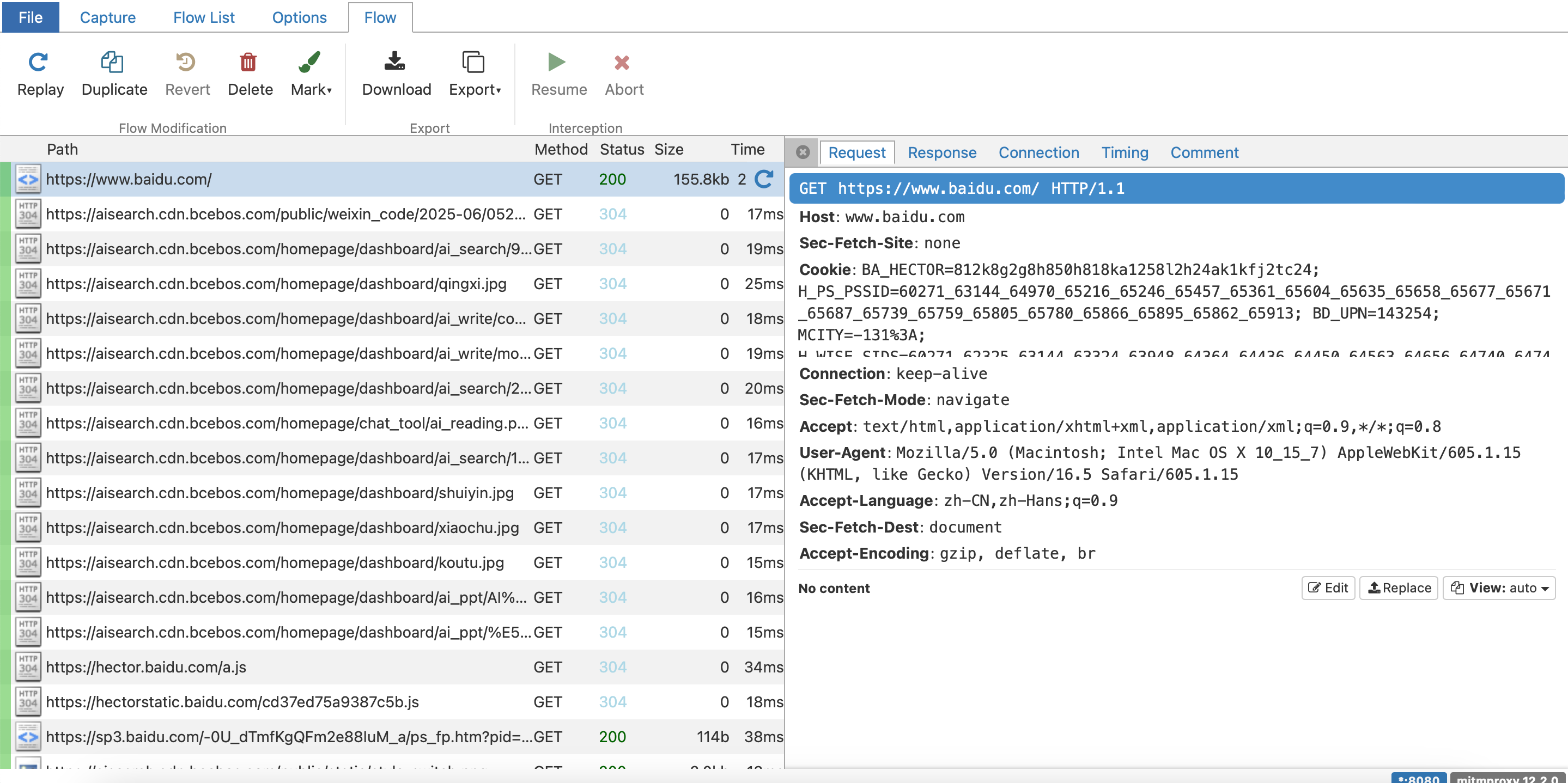 mitmweb 启动后会在本地打开一个网页界面,它在体验上更像浏览器的 Network 面板,界面直观,便于查看请求详情和响应内容,适合不熟悉命令行的同学。下面我们来看下 mitmweb 中搜索请求、查看 headers、保存 HAR、甚至回放请求。