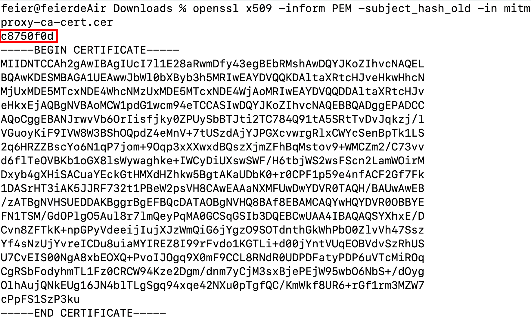 openssl x509 -inform PEM -subject_hash_old -in mitmproxy-ca-cert.cer - 将证书改名为:c8750f0d.0