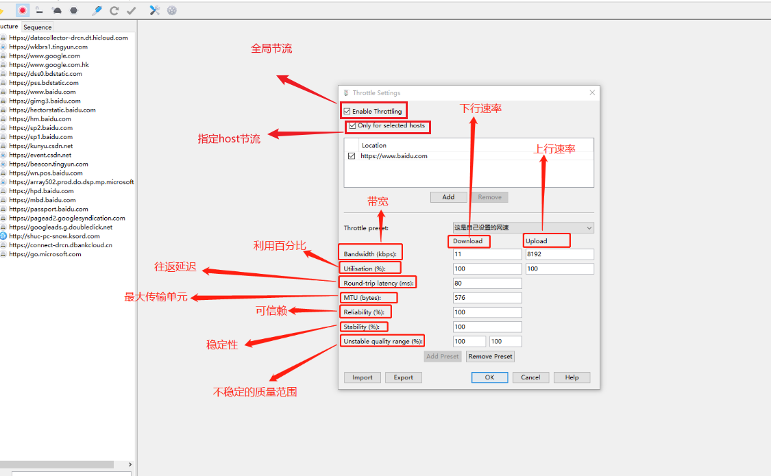 除了使用预设的弱网配置外,我们还可以自定义网络参数。 在 Throttle settings 中,我们可以调整带宽、上传/下载速度、延迟、丢包率等参数, 甚至可以选择特定的域名进行弱网模拟。 这样可以精准地模拟应用在特定网络环境下的表现。 例如,通过调整 Bandwidth 和 Round-trip latency 参数,我们可以模拟用户在地铁或山区等信号差的地方的使用体验,帮助开发团队优化性能。